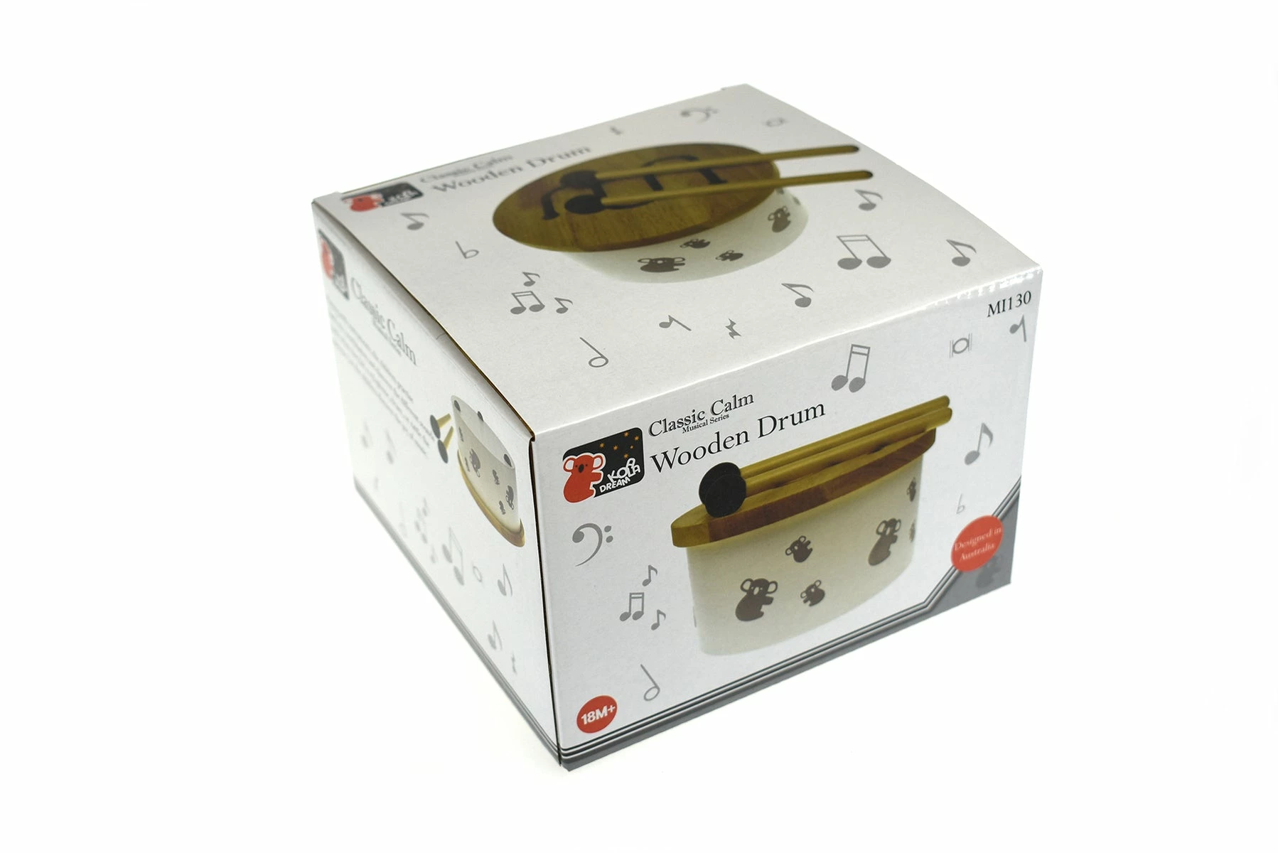 This gorgeous wooden drum is made from natural wood and covered with drawings of our cute koalas. Beautifully boxed and comes with 1 rubber ended drumstick. Drumming is a fantastic example of a skill that teaches discipline. Kids will have hours of fun play alone or with friends. For a clear/ better sound quality , the drum needs to be placed on soft surfaces.
